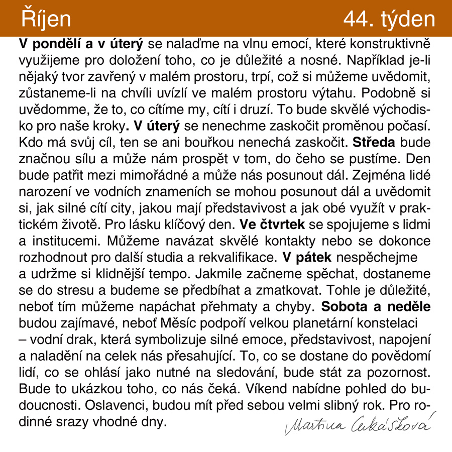Pokud se nelekneme, můžeme toho ve středu a následných dnů zvládnout hodně, neb sil bude na rozdávání a fascinace tématy, která jsou pro nás důležitá, také nebude chybět. Vnitřní úzkost z možného rizika, chyby nebo nezdaru, je nutnou podmínkou, jinak bychom se nedokázali oddělit od toho, co je přežité, prošlé, známé či příliš obecné. Je třeba zkusit a risknout to, že do stávajícího vložíme něco našeho, něco, o čem víme, že není jisté, zda to bude přijato. Jak to myslím?