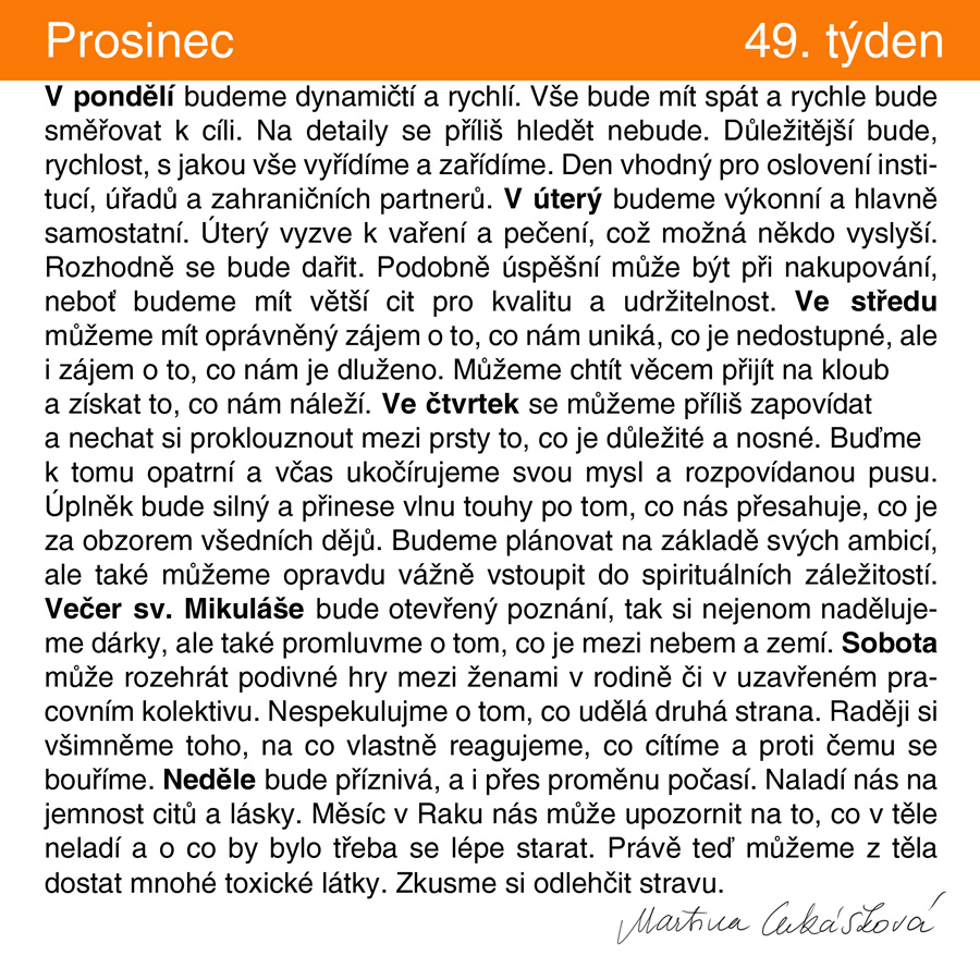 Znamení Střelce proto hledá za horizontem toho, co známe. Snaží se objevit to, co by mohlo moci udržet vnitřní oheň a pomoci v době nedostatku ohně-tepla vnějšího. Jak dobře to naši prapředci věděli a už dávno se v tuto dobu setkávali se v sednicích a klábosili po večerech a nocích. Vyprávěli si příběhy, historky, báje, alespoň tak aspoň slovem přesahovali to, co je známé a otevírali světy neznámé. Jak dobře věděli, že tma dlouhodobě člověku neprospívá. Severské národy by mohly vypravovat. Ale zpět k našemu horoskopu, tohle vše píšu proto, že nás v předvečer svátku sv. Mikuláše čeká úplněk ve Střelci, který bude rozhodující proto, zda se nasměrujeme a zatoužíme opravdu po světle, nebo zda budeme jen přežívat.