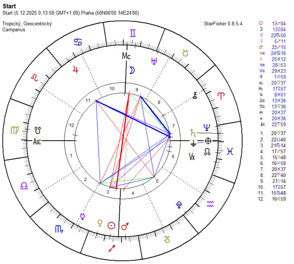 Úplněk budeme mít pěkně vysoko (psal o tom pan Turnovský, tak to přeskočím) a připomenu, že proti Luně bude Slunce s Venuší a Marsem ve Střelci. Funkce hodnotící, Venuše Jitřenka bude usilovně tlačit na pilu, aby se šlo za tím, co nás láká, aby se vykročilo, podniklo něco, a to rychle s plnou silou. Její výkonná složka, Mars, reprezentující akceschopnost organismu, stojí při Venuši a kam ona ukáže, tam Mars nasměruje své síly