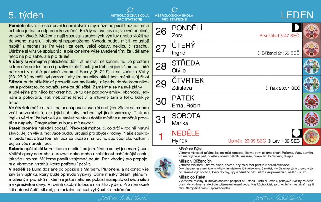 Pátý týden roku 2026 otevřela první lunární čtvrť a bude ho uzavírat nedělní pozdě večerní úplněk. Máme týden plný napětí a situací, které poukážou na to, jak jsou naše plány do budoucna děravé, kde je třeba improvizovat, kde ubrat a kde se nebát prosadit. Udělat si plán totiž nyní nestačí. Je třeba být neustále ve stavu, který je ochotný znovu a znovu improvizovat a přizpůsobovat se nově situaci. Držet si pevný plán bez ochoty k jeho úpravám bude opravdu nelehké.