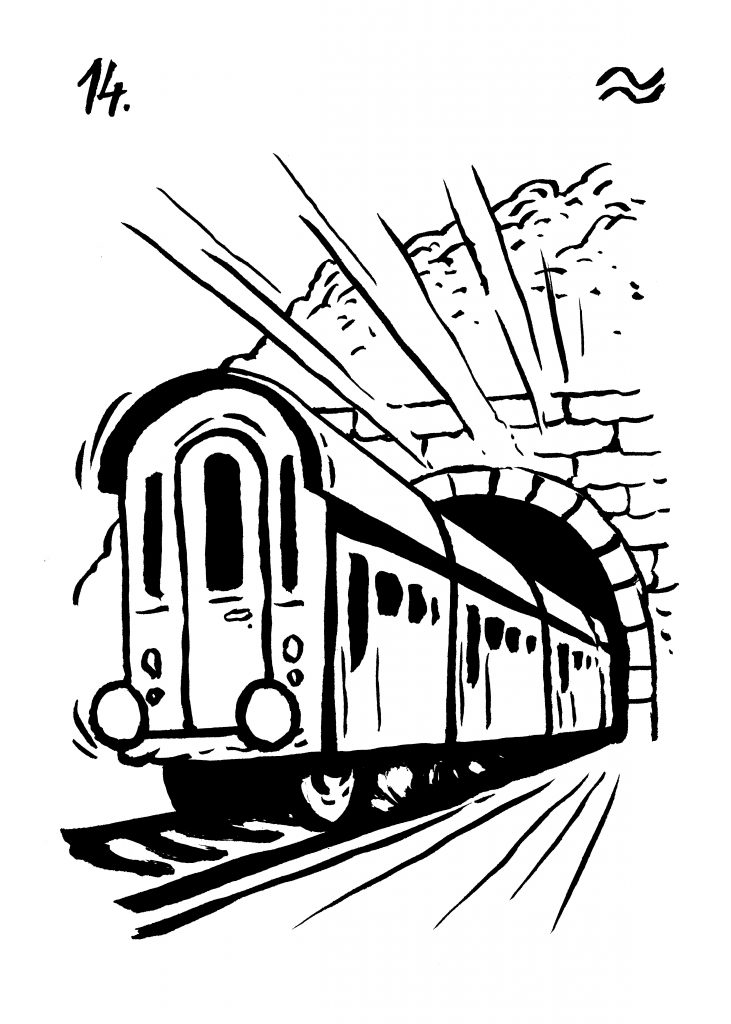 Slunce ukazuje zdroj životní síly, tj. jak jednat a symbol mluví o tom, že je nutné využít toho, co společnost vybudovala (železniční sít) a díky tomu se dostat rychle tam, kam bychom jinak šli velmi dlouho. Projet skálou je velká věc, takový tunel nás konfrotuje nejenom s rychlostí spojení mezi dvěma body – místy, ale také o velikosti ducha člověka, kterému se podařilo překonat překážku, velikost jeho společného úsilí – dělníci, kteří věc společně odpracovali, sílu kamene, velikost skály a její moc, ale také to, že skalní útvary oddělují jeden typ krajiny od druhého a když projedeme tunelem, jsme rázem jinde. Můžeme tedy za pomoci lidských výdobytků projet na druhou stranu, dostat se k nové příležitosti.