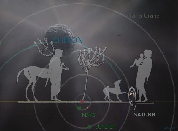 Promítneme-li si řecký mýtus o kentauru Cheirónovi (z řečtiny, cheir - ruka) na asteroid Chiron (obvykle užívaný latinský název), začneme rozpoznávat mnohé z významů, které nám přináší. Spolu s ostatními planetkami má svůj původ v Kuiperově pásu, za drahou planety Neptun (matka - dcera Ókeana-Neptuna) a protíná dráhu Saturnovu (otec Kronos-Saturn). Asteroid je velmi neobvyklý a originální, neboť se chová jako kometa, vypařuje plyny. I kentaur Cheirón se chová neobvykle, je učitelem, léčitelem, vychovatelem, věštcem, hudebníkem a v neposlední řadě samozřejmě bojovníkem. Za povšimnutí stojí jeho doba oběhu, která není stabilní a podle gravitačního působení planet se může v budoucnu změnit. V analogii lidskému životu je to doba, kdy ženy i muži procházejí tzv. "přechodem". Ženy prožívají zásadní změnu - menopauzu a muži jsou konfrontování se ztrátou fyzických sil. Je tedy otázkou, zda do významu jeho astrologické interpretace nezařadit i možnost, že se Chiron stává ukazatelem místa, kde budeme na svůj přechod z jednoho období do druhého nejcitlivější. Uvážit, zda není jeho pozice místem, kde se můžeme mnohému naučit, místem, kde můžeme vyměnit doposud jistou-trvalou sílu za poznání hlubší.